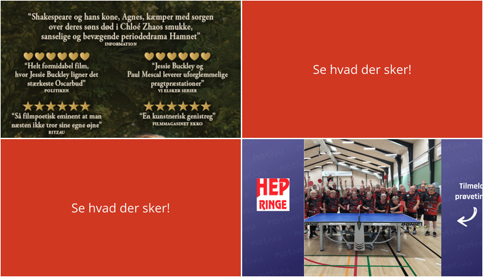 Ringe byder på et par spændende aktiviteter den kommende uge, som bryster sig af både kulturelle oplevelser i biografen og fysisk aktivitet i form af bordtennis. Så uanset om du har lyst til at synke ned i biografsædet eller få lidt motion, er der noget for alle.